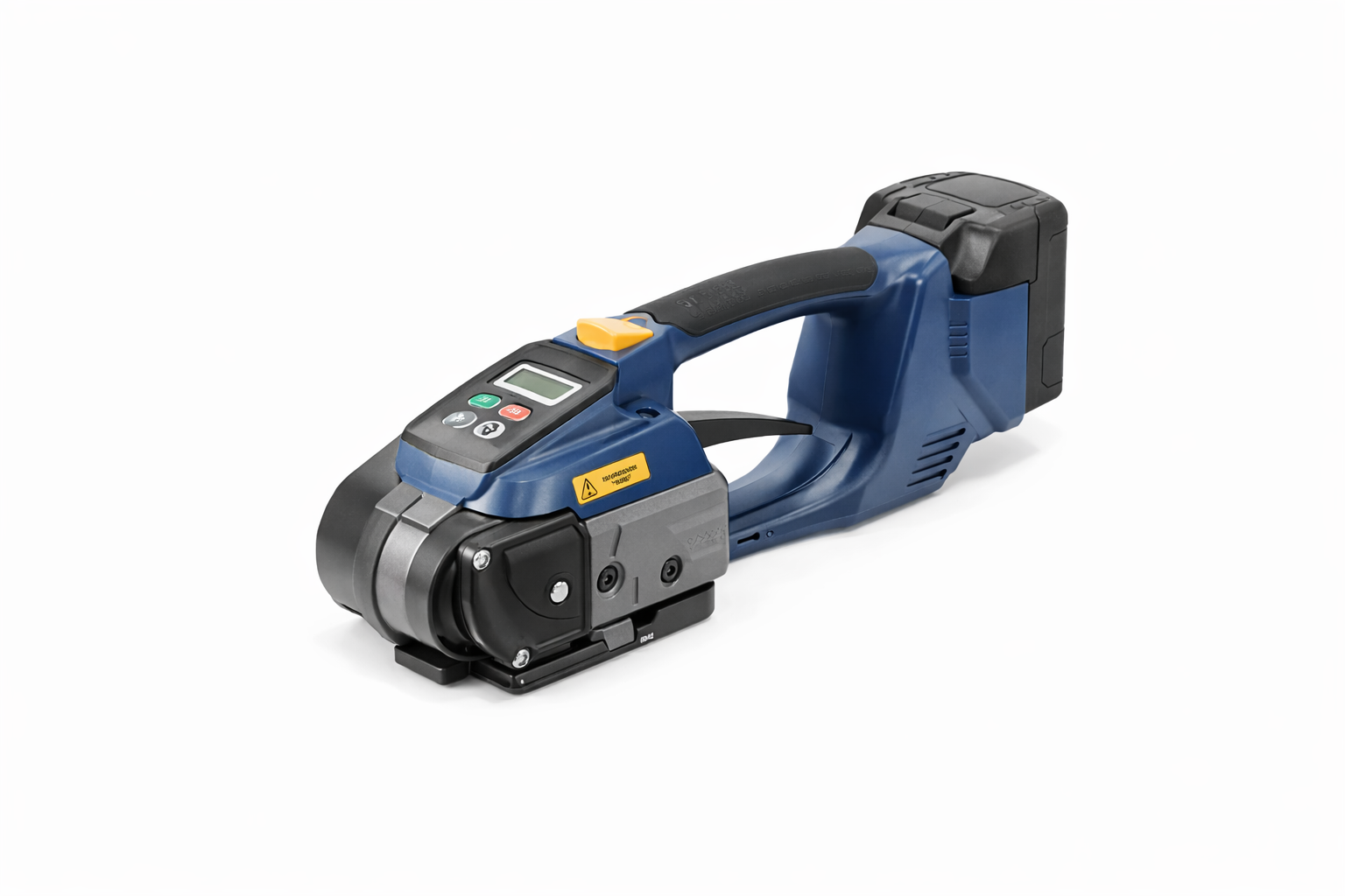 Flejadora semiautomática diseñada para agilizar el flejado de cajas y paquetes en entornos logísticos e industriales. El operario posiciona el producto y la máquina realiza automáticamente el tensado, sellado y corte del fleje, mejorando la eficiencia del proceso de embalaje.